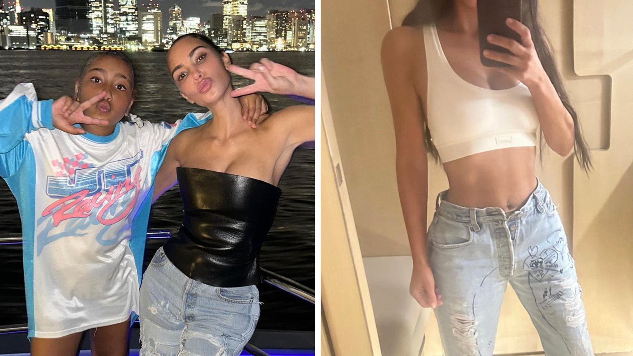 Kim — who shares North, 10, Saint, 7, Chicago, 5, and Psalm, 4, with ex-husband Kanye West — shared a series of photos featuring her kids’ sweet gift, including two shots of herself rocking a white bralette with the light blue jeans.