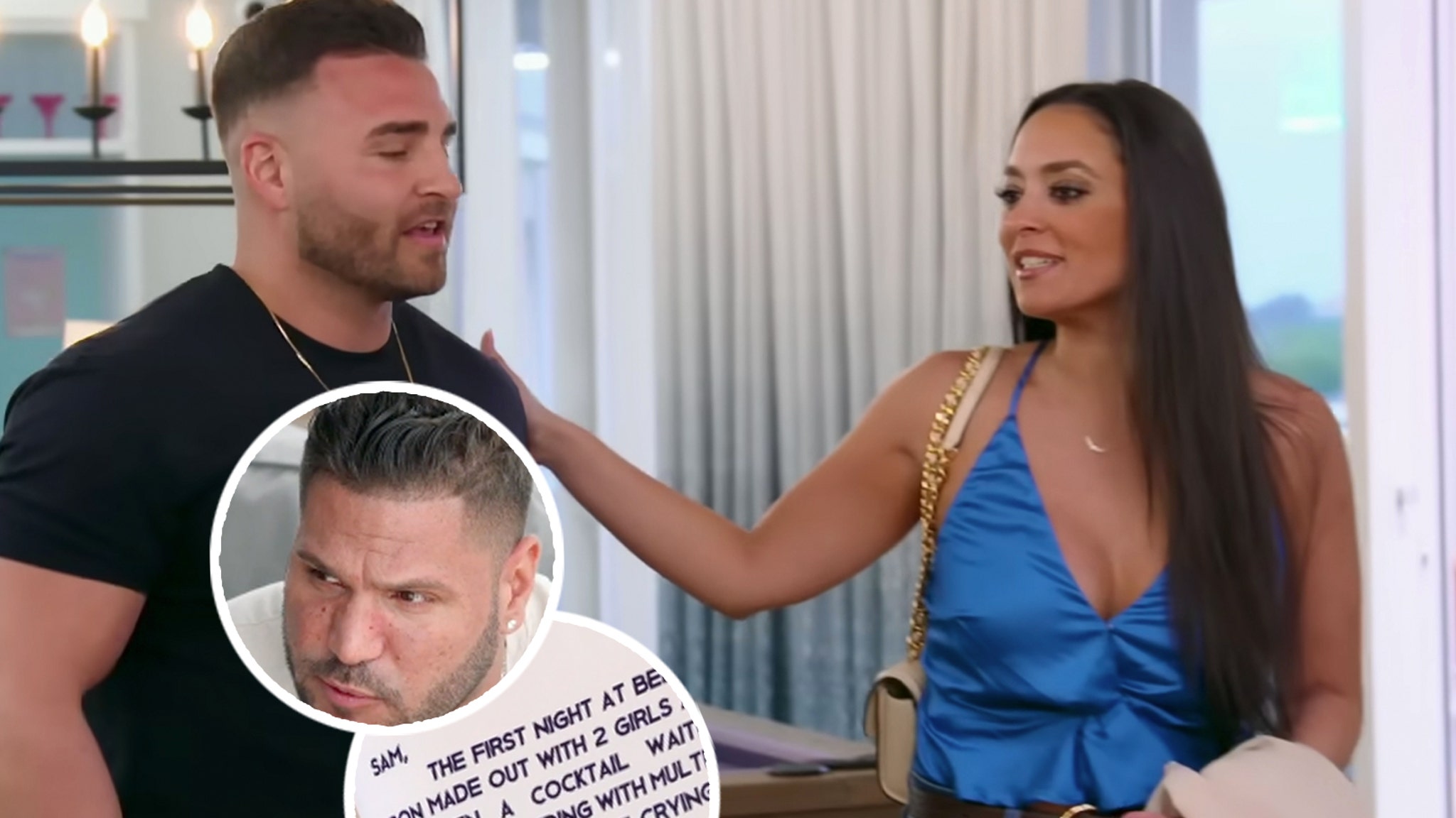 When Justin finally showed up to Margaritaville Resort, he got some serious smooches from Sam upon his arrival. She then took him to her room, where Pauly D had quite the surprise waiting. Before Giancola even got there, he had pillowcases and comforters made covered with “The Note,” which Sam’s female costars famously wrote back in the day warning her of Ron’s indiscretions.